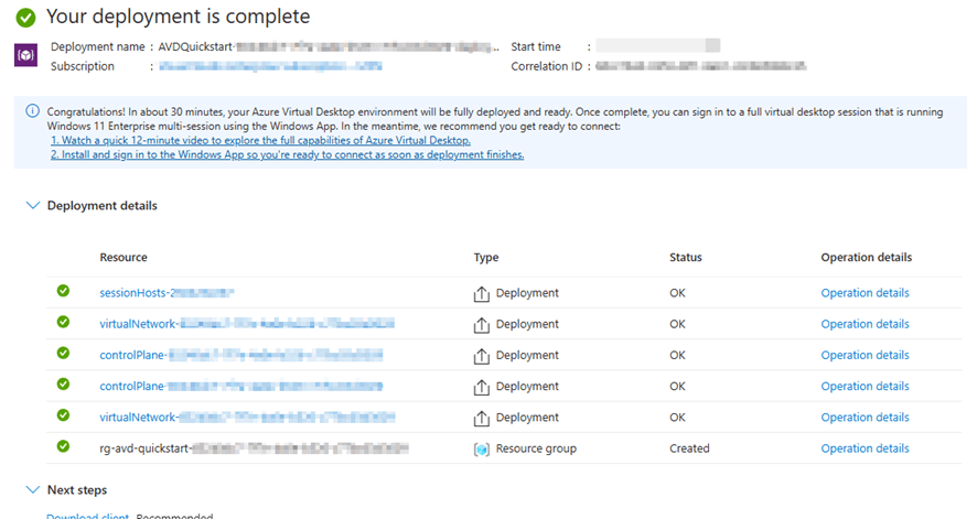4. It will take approximately 15-20 minutes. It is a bit longer than a “standard” AVD deployment of the same size because Quickstart will build all of the Azure infrastructure needed for AVD. A Resource group, VNet, as well as the host pool and the session host (VM).