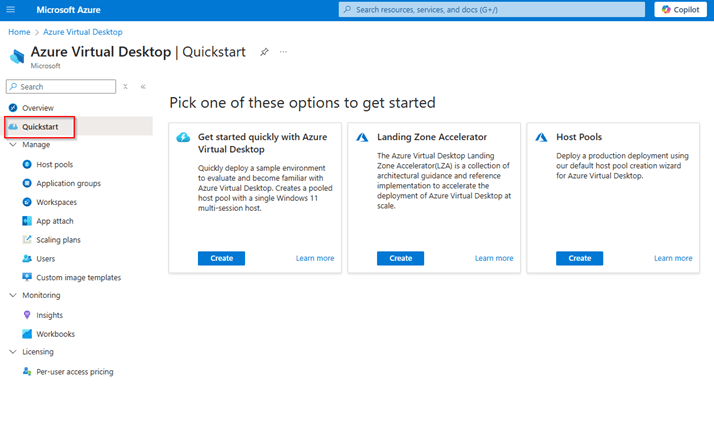 2. Under “Get started quickly with Azure Virtual Desktop,” click “Create.”