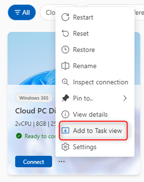 - From the Windows App, select the Cloud PC that you want to be available with Windows 365 Switch and click on the user action menu (three dots).
