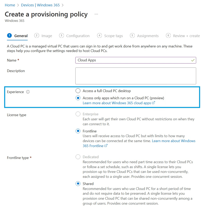 2. Select the “General” tab, for “Experience” (which is a new category), select “Access only apps.” This selection defaults the License type to Frontline and Shared mode