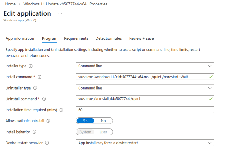 5. Configure the install/uninstall command under “Program” with the following command lines/settings.